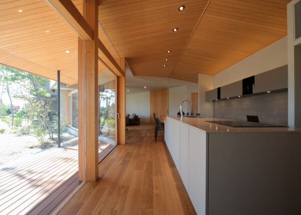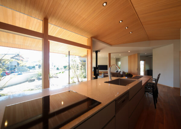 特に天井は緩やかな勾配を持たせることで、視線が自然と外へ向かい、室内に広がりをもたらしています