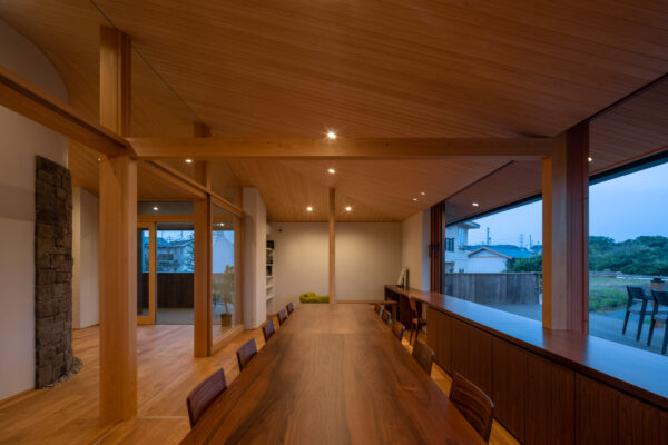 大きく設けた開口部は、外部の風景を室内へ取り込み、時間帯によって異なる表情をつくり出します。
