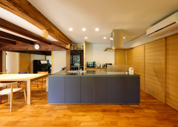 築150年の古民家をフルリノベーションしたこちらのお家では、キッチンをダイニングスペースに面して配置する事で家族の団欒や会話が生まれるデザインにしています。