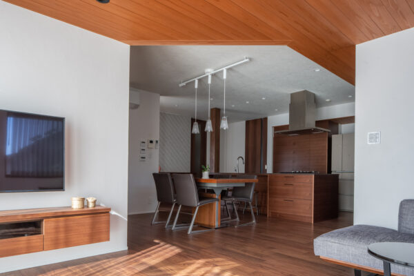 壁は白を基調とし、余白を意識しました。装飾を増やすのではなく、引き算で整える。テレビボードを浮かせることで床面をすっきりと見せ、光が回り込む面積を確保しています。照明はダウンライトを必要な場所に絞り、ダイニングにはペンダントを配置しました。光源の高さを変えることで空間にリズムが生まれ、夜は天井の木目がやわらかく浮かび上がります。昼と夜で異なる表情を楽しめる住まいになります。