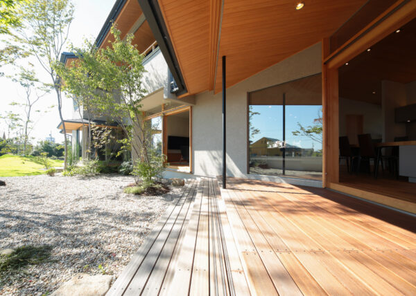 軒天やデッキに使われた木は、光を受けることで陰影が際立ち、空間に奥行きを与えます。