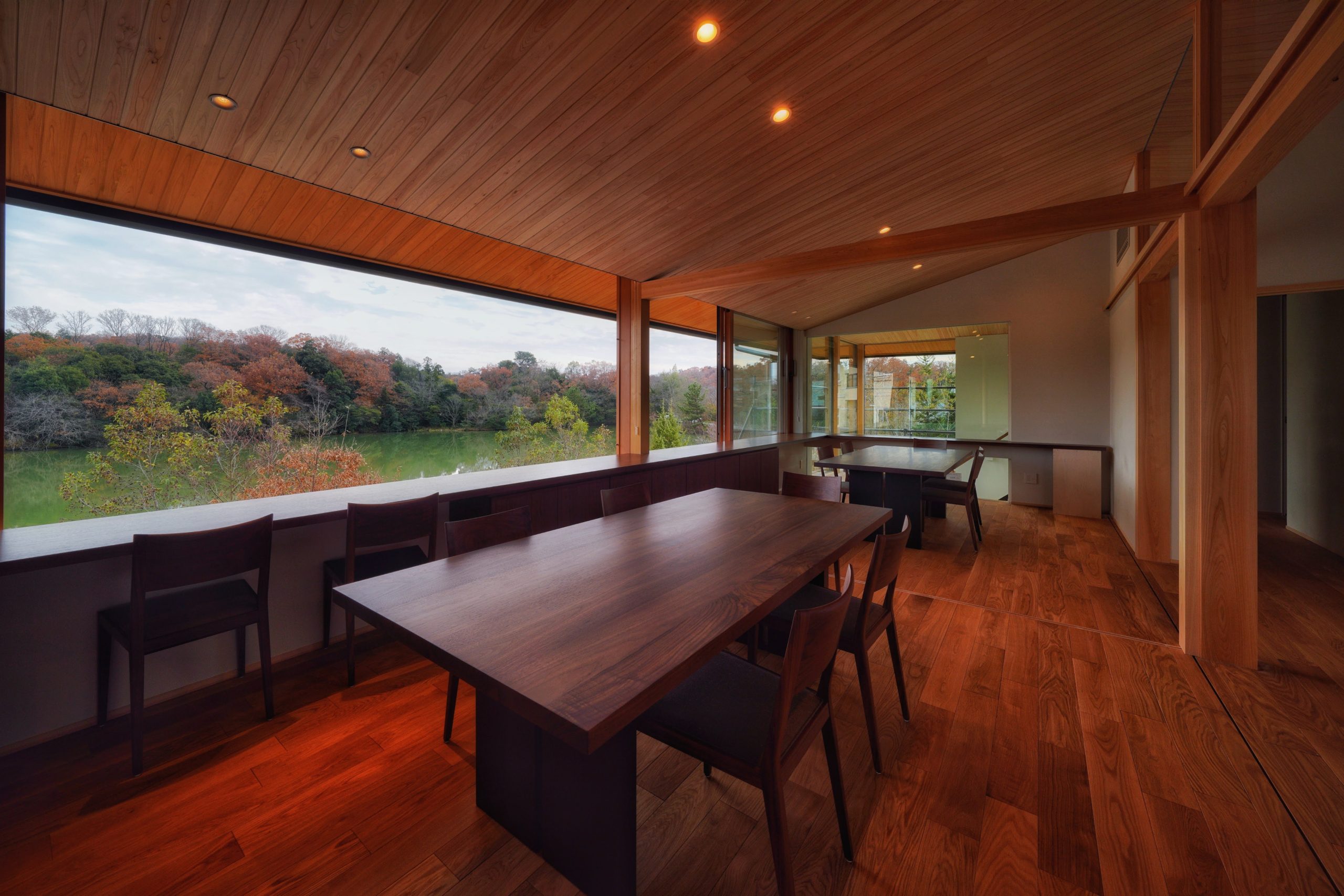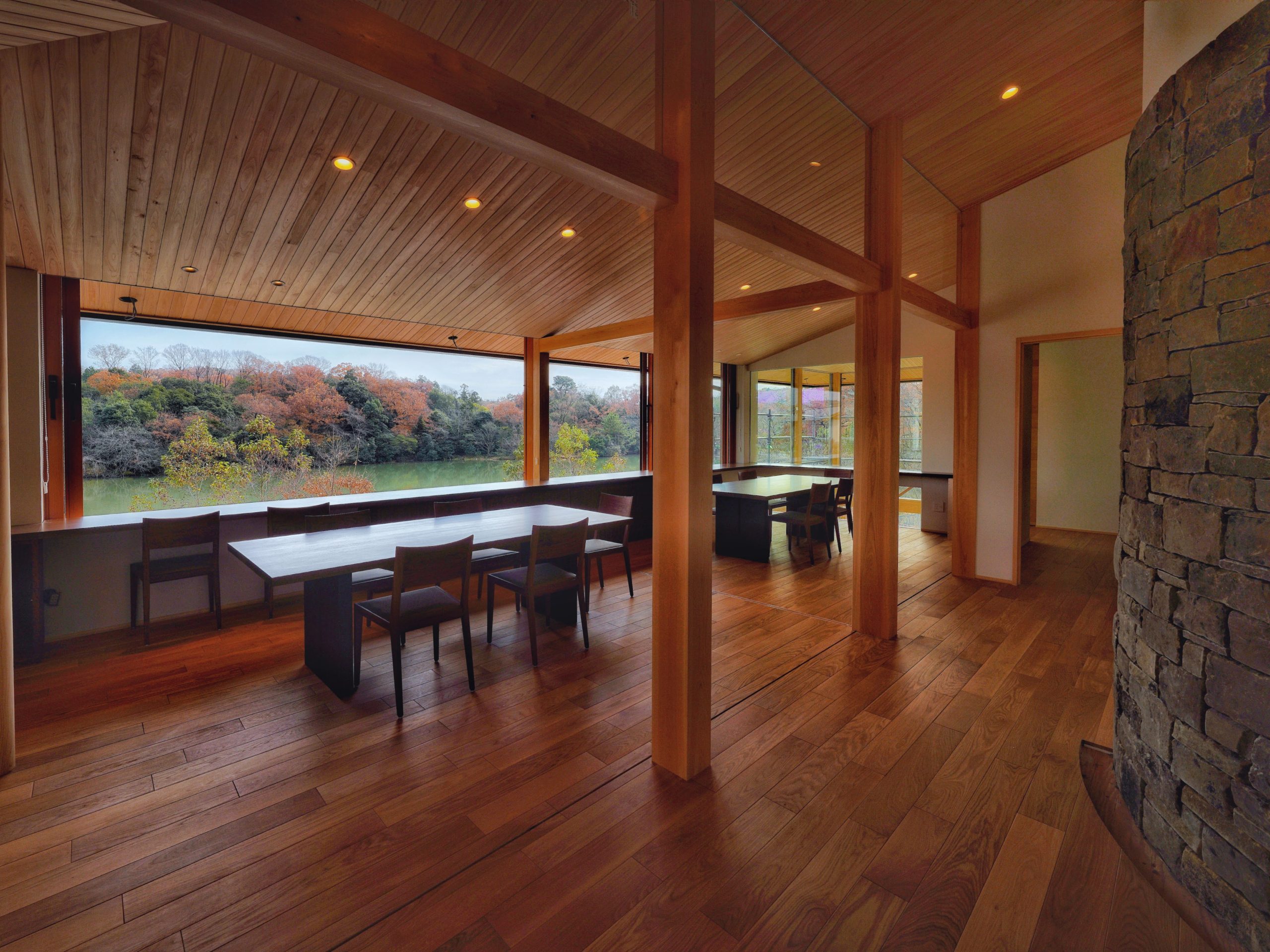 天井を勾配にすることでより自然と外へ視線が流れるようにも設計されているので、お打ち合わせに見えたお客様もついつい四季折々の景色に見とれてしまうかも知れませんね。