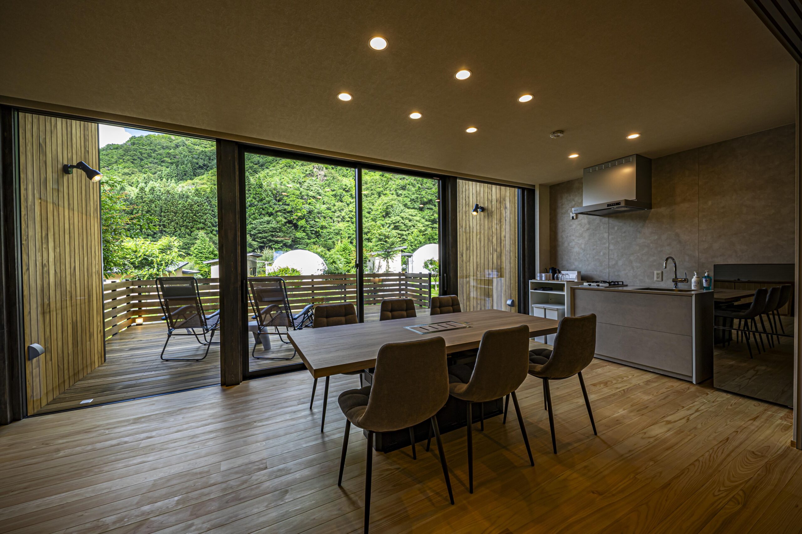 ダイニングはデッキへとつながり、内外が一体となって自然を感じられる構成となっています。